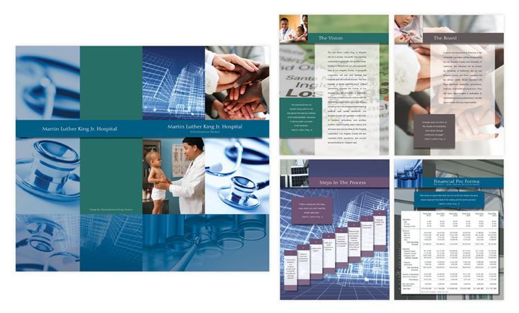 Presentation Folder and 4 Inserts to outline the proposed future for the Martin Luther King Jr. Hospital in Los Angeles, CA. This was a recruitment piece to find the new board of directors for the hospital.