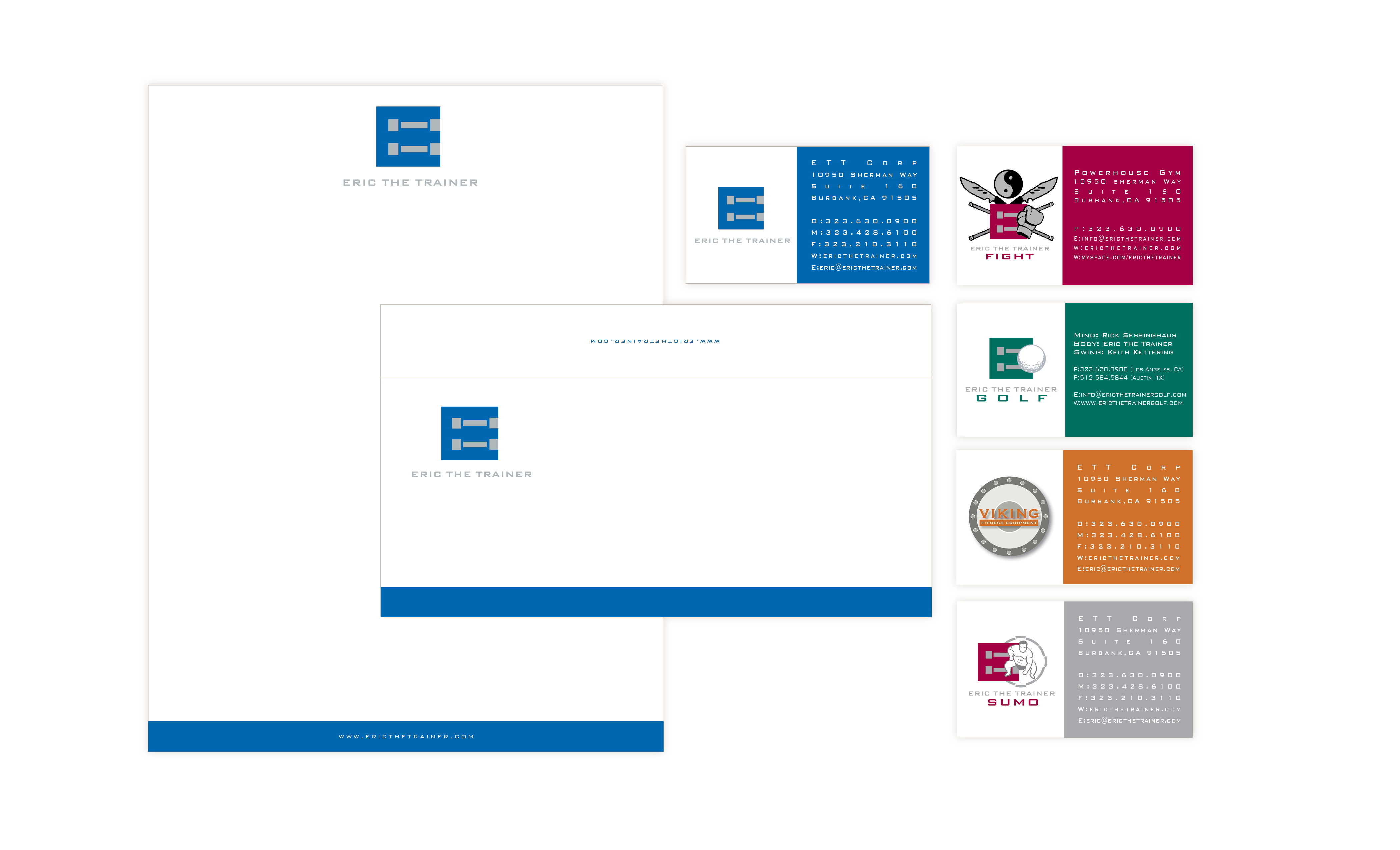This identity was designed for a personal trainer who has also developed a unique set of fitness programs under the Eric the Trainer umbrella: ETT Fight, ETT Golf, ETT Viking and ETT Viking. All the programs have to work under the original identity but still have their unique visual presence.