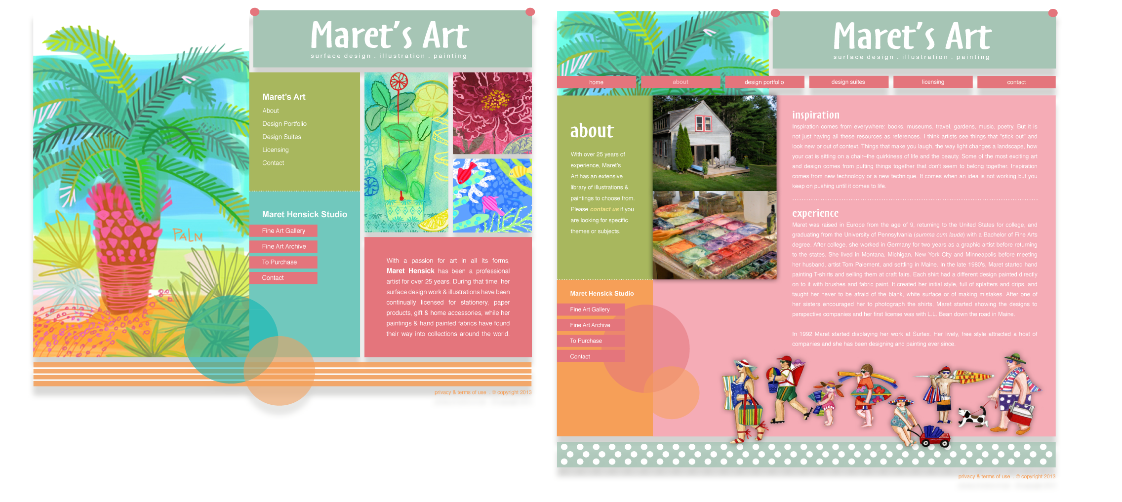 This website was designed to express the wonderful and colorful designs of a surface designer. The website has two sides: one a constantly changing portfolio for the commercial licensing of designs and the other as a gallery to sell her fine art paintings, collages and prints.